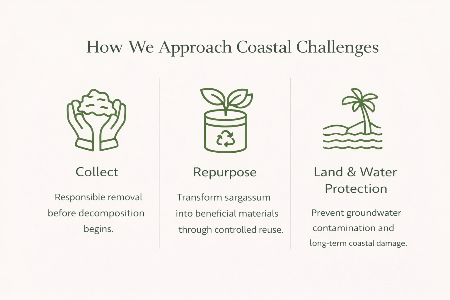 Coastal Green Horizon provides responsible sargassum collection, removal, and reuse—focused on environmental protection, regulatory awareness, and long-term solutions rather than quick disposal.